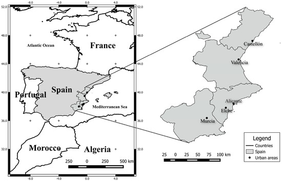 The study area was the main urban nuclei in the regions of Valencia and Murcia on the Spanish Mediterranean coast. These cities were the four provincial capitals, as follows: from north to south, Castellon, Valencia and Alicante in the Valencian Region and Murcia in the Region of Murcia, as well as Elche, the third-largest urban area in the Valencian Region (Figure 1), which we added.