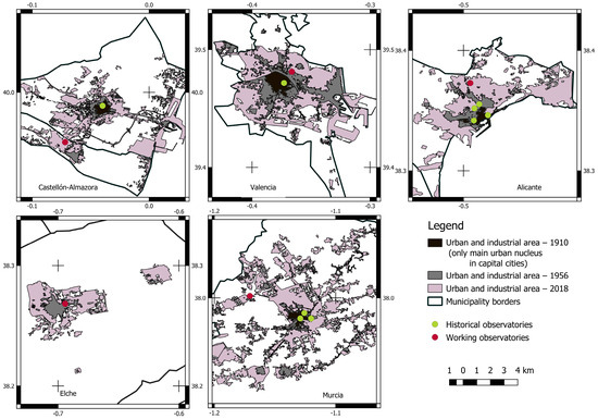 While municipal data can provide a rough estimate, this study went beyond these administrative boundaries. After a first test, taking municipal boundaries as a study framework was discarded given the sometimes fringe location of the official AEMET observatories within the administrative boundaries, as is the case of the Castellon–Almazora observatory (Figure 2), and the enormous disparity in size of the municipalities; from 142.7 km2 in Castellon and Almazora and 136 km2 in Valencia, the areas increase southwards, rising to 202 km2 in Alicante and 325.5 km2 in Elche before culminating in 885 km2 in Murcia, one of the largest municipalities in Spain. The geographical context in which urban areas stretch across municipal boundaries prompted us to draw a polygon centred on operational urban observatories at a scale of 1:75,000, giving an area of about 417 km2 for each urban area; this enabled us to quantify the artificial growth around the observatories while keeping a rural environment, thus enabling us to ascertain the impact of major land use changes on temperatures.