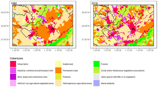LULC distribution in Murcia’s urban area between 1990 (left) and 2018 (right), with historical (black point) and working (grey point) observatories. Source: “Generated using European Union’s Copernicus Land Monitoring Service information; <https://doi.org/10.2909/5c1f2e03-fcba-47b1-afeb-bc05a47bada0> <https://doi.org/10.2909/71c95a07-e296-44fc-b22b-415f42acfdf0>”.