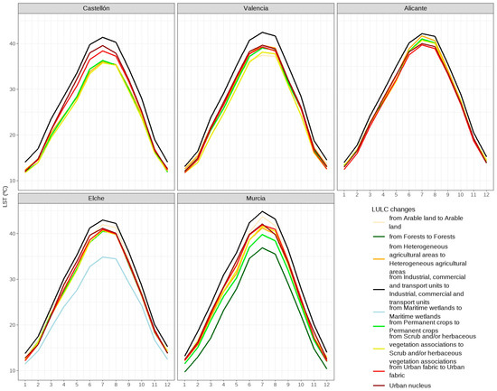 Monthly evolution of LST by urban area for constant uses. Source: [60,61,74]. “Generated using European Union’s Copernicus Land Monitoring Service information; <https://doi.org/10.2909/5c1f2e03-fcba-47b1-afeb-bc05a47bada0> <https://doi.org/10.2909/71c95a07-e296-44fc-b22b-415f42acfdf0>”.