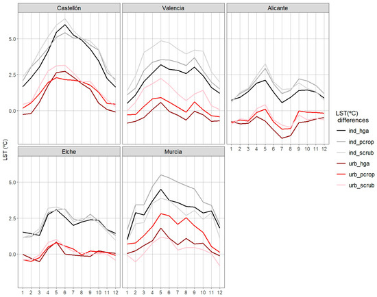 As a summary of the results for the different urban areas, Figure 10 shows the monthly evolution of the UHI, expressed as the difference in LST between the two artificial uses, the urban fabric and the industrial, commercial, and transport units, and three representative non-urban uses. The greater power of the UHI is detected in the warm months, which was already intuited in the monthly evolution of the LST shown in Figure 9. However, there is no lack of interesting differences. Castellon shows a single peak centred in June, while the remaining urban areas reflect a double peak in May and September, separated by relatively lower values. This behaviour is especially marked in Alicante, where the UHI in relation to the urban fabric is negative in practically all months and, in July and August, is lower than in winter. This inversion of the UHI is repeated in Elche, but very limited in months and intensity.
