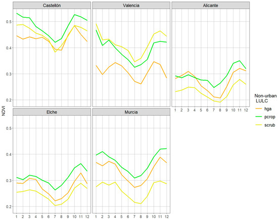 Monthly evolution of UHIs by urban area for constant uses. Ind_hga: industrial, commercial, and transport units minus heterogeneous agricultural areas. Ind_pcrop: industrial, commercial, and transport units minus permanent crops. Ind_scrub: industrial, commercial, and transport units minus scrub and/or herbaceous vegetation associations. Urb_hga: urban fabric minus heterogeneous agricultural areas. Urb_pcrop: urban fabric minus permanent crops. Urb_scrub: urban fabric minus scrub and/or herbaceous vegetation associations. Source: [60,61,70]. “Generated using European Union’s Copernicus Land Monitoring Service information; <https://doi.org/10.2909/5c1f2e03-fcba-47b1-afeb-bc05a47bada0> <https://doi.org/10.2909/71c95a07-e296-44fc-b22b-415f42acfdf0>”.
