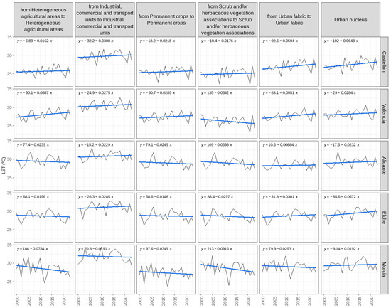 Annual evolution of LST by urban area for constant uses. Source: [60,61,74]. “Generated using European Union’s Copernicus Land Monitoring Service information; <https://doi.org/10.2909/5c1f2e03-fcba-47b1-afeb-bc05a47bada0> <https://doi.org/10.2909/71c95a07-e296-44fc-b22b-415f42acfdf0>”.