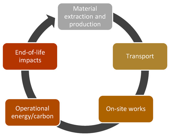 The energy and carbon impacts of construction in five main life cycle phases (redrawn by the authors and adapted from [9]).