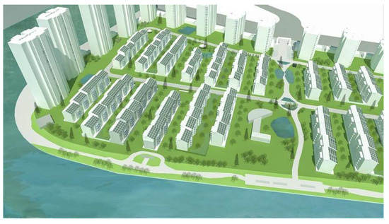 A further example was studied. This project proposal is a mix of residential high-rise and low-density buildings in Ningbo, on a large riverside site facing development (Figure 5) [18]. This proposal’s aims were relevant to this paper’s topic and to illustrate some advantages of low-density typology. These are worth a brief note: the low-density solution enables all apartments to face the sun, all well daylighted and all naturally cross-ventilated, with a passive and active solar design, low EC materials, and lastly, sufficient parking area under the buildings; hence, there are no EC impacts of the underground structures extending across large parts of the site. The proposed high-rise part is somewhat similar to the existing Ningbo city block analyzed above. The data in case 3 were only studied for comparative purposes to verify/solidify the findings of our major case 2, and are therefore not presented in detail. The data revealed a similar total EC picture. In this case, the buildings above ground, however, employed a design with much lower EC, around 350 kgCO2e/m2, including low-carbon concretes, minimal use of synthetic polymers, and lightweight interior partitions amongst other features with less embodied energy and carbon. As suggested above, this move to low-impact buildings leads to the site works’ contribution to the overall EC becoming considerably larger: in this case, over 28% of the total of the high-rise part of the project. This design study thus broadly confirmed the above tendencies.