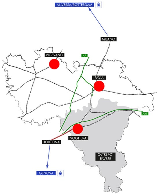 Additionally, Voghera occupies a strategic position at the provincial level. It is a crucial infrastructure node connecting national and international railway networks (Figure 2). In particular, the transport network connects the city to various important destinations. The city is intersected by several state roads, including SS10 and SS35, and serves as the origin of SS461. Additionally, it is served by the A21 highway (Turin–Piacenza) and the A7 highway (Milan–Genoa).