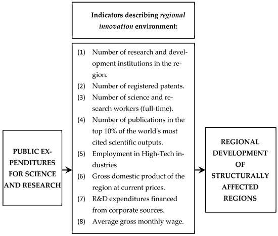 We consider public financial support for science and research as an independent variable that influences the level of the innovation environment in the region, i.e., it affects the eight indicators defined above. The quality of this environment and ecosystem then represents an effective way of regional development, especially in the case of structurally affected regions [20]. This concept is illustrated in Figure 1.