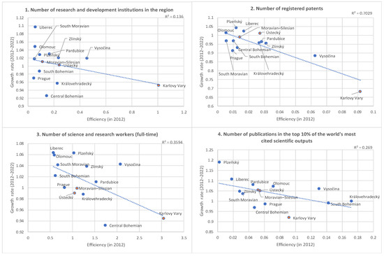 In order to assess the development of the efficiency of public support in terms of selected indicators across regions and to answer the research question RQ1, the concept of beta-convergence based on the neoclassical theory of economic growth [53] was applied, as previously used by, e.g., Hong et al. [54], or Desli and Gkoulgkoutsika [55]. The beta-convergence method allows one to assess whether poorer regions are catching up with richer regions through the growth coefficient. Real convergence can also be seen as a structural convergence of the technologies used, in our case the calculated efficiency. In order to present beta-convergence, a two-dimensional graph is used, in which the X-axis is plotted with the level of efficiency of public funds at the beginning of the study period (i.e., in 2012), and the Y-axis with the average growth coefficient of the indicator under study over the study period (i.e., 2012–2022). The data for each of the eight indicators were first recalculated in relation to public funding for science and research in the regions. This adjusted data on particular indicators tell us about their “efficiency” and thus how much CZK 1 million invested in science and research generates in patents, high-tech employees, publications, etc. Based on the economic theory [56], the efficiency of public expenditure on R&D for each indicator was calculated as follows: