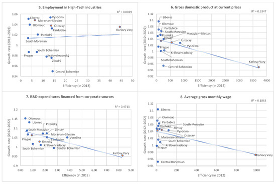 Figure 3 shows the beta-convergence of indicators (5) to (8). Employment in high-tech sectors, i.e., indicator (5), was the only indicator in which all three peripheral (structurally affected) regions had the growth rate higher than 1 over the observed period, and thus, there was an increase in the efficiency of public financial support in relation to this indicator (in the Moravian-Silesian region, this growth value was the third highest). High-tech industries are endowed with the ability to create high added value per employee, which contributes to the economic growth of the region, as well as the ability to innovate and create new technologies and products that can improve the competitiveness of the region [45]. This factor is a key element for structurally affected regions in the process of their economic transformation, leading to the successful development of the territory. On the contrary, a decrease in efficiency growth was observed for the capital city of Prague and the Central Bohemian Region.