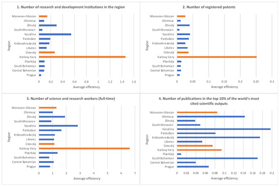 The results for the average efficiency of public support for R&D, calculated for each region separately, are shown in Figure 4 and Figure 5. As seen, with the exception of indicator (4), the Karlovy Vary Region achieved the highest average efficiency for public spending on R&D in the analysed period 2012–2022. While the relative growth of this efficiency based on the beta-convergence analysis was rather decreasing, and the Karlovy Vary Region lagged behind other regions, in absolute terms (using the average efficiency), this support was the most efficient. This may be due to the fact that the Karlovy Vary Region has a very poor innovation environment, so the effect of increasing R&D funding may be higher on average than in other regions. However, given the lagging level of the innovation environment, the growth rate of this efficiency may tend to lag behind that of other regions.