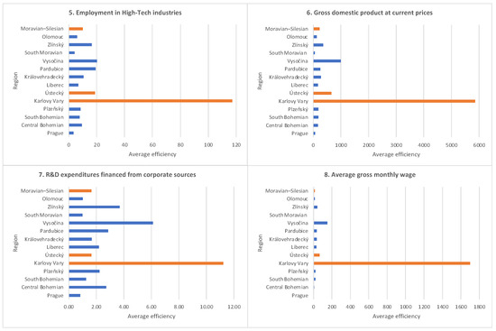 Figure 5 shows the efficiency of public support for R&D in terms of indicators (5), (6), (7), and (8). Similarly, as in Figure 4, the highest average efficiency was found for the Karlovy Vary Region, while the lowest values were confirmed for the Prague Capital City and the South Moravian Region. In developed regions with a relatively high-quality and developed innovation environment (e.g., Prague, South Moravian Region, Central Bohemia Region), public financial support for R&D is, on average, less effective than in regions with a significantly underdeveloped innovation environment (peripheral Karlovy Vary Region).