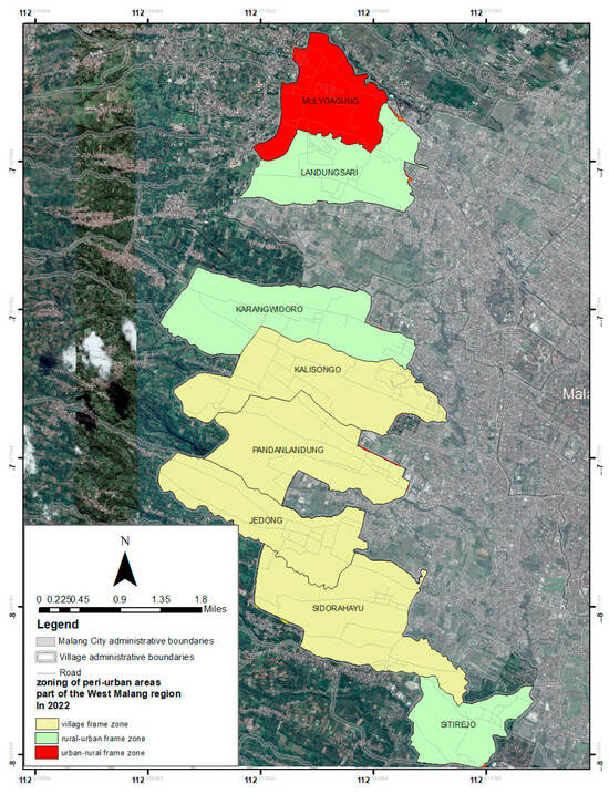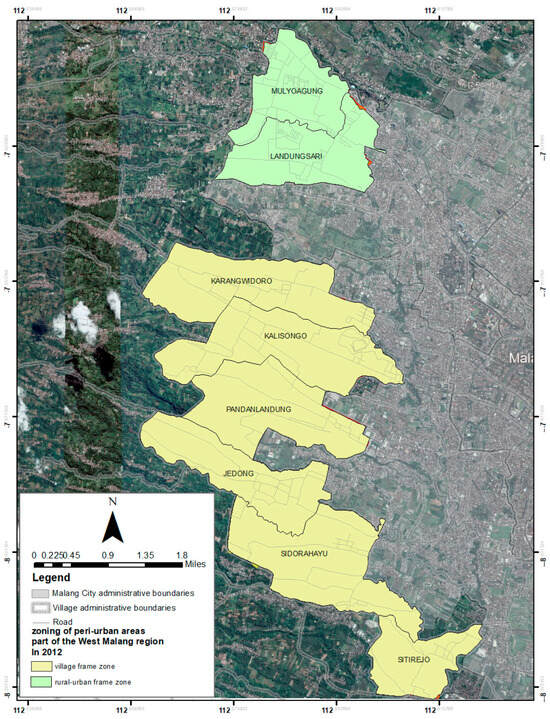 Over time, the development of Malang’s western suburbs will exhibit urban characteristics while retaining some village attributes, necessitating careful management of the peri-urban area’s growth and dynamics. The development in the peri-urban area tends to be scattered before gradually becomes more clustered, forming distinct zones or clusters. Therefore, this study aims to quantitatively measure the spatiotemporal dynamics and community perception of peri-urban development with the empirical case of Malang City, Indonesia. The objectives of this research are to (1) identify land-use change of the western peri-urban area of Malang City, (2) analyze the zoning typology of the western peri-urban area of Malang City in the years 2012–2032, and (3) identify the settlement pattern and community perception of the western peri-urban area of Malang City.