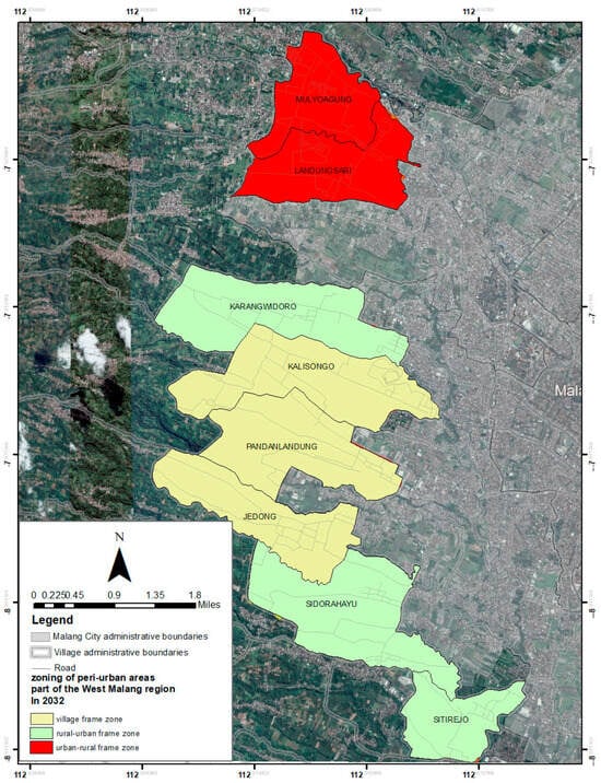 In Mulyoagung village, Dau subdistrict, the highest level of urbanization (urban–rural frame zone) is observed, where non-agricultural land use predominates due to the prevalence of urban settlements. Conversely, Karangwidoro and Landungsari villages, categorized under the village–urban zone, are transitioning toward urbanization. This transition is evident in the activity intensity within the peri-urban area, as reflected in building density, where higher densities correlate with urban characteristics. Conversely, in the peri-urban area of Wagir subdistrict, Jedong, Pandanlandung, and Sidorahayu villages remain predominantly rural (village frame zone), as agriculture occupies a larger proportion of land compared to non-agricultural use. Sitirejo, however, stands out as a developed village in the village–city frame zone, signaling its nascent urban nature. The prediction of peri-urban zonification in 2032 can be observed in Table 6.
