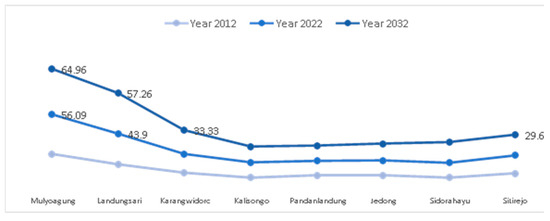 The development dynamics of the peri-urban area of western Malang were analyzed to assess the level of development in 2012, 2022, and projected for 2032. Figure 4 illustrates the development dynamics of peri-urban areas in each village from 2012, 2022, to 2032.