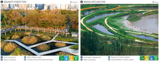 (A) Strategies used in Benjakitti Forest Park and the applied sustainable development goals, reprinted with permission from Ref. [5]; (B) strategies used in Minghu Wetland Park and the applied sustainable development goals, reprinted with permission from Ref. [6].