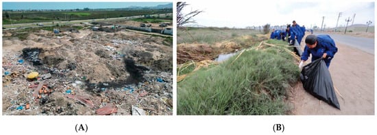 (A) Solid waste pollution in Pantanos de Villa, reprinted with permission from Ref. [23]; (B) marsh cleanup conducted by volunteers, reprinted with permission from Ref. [24].