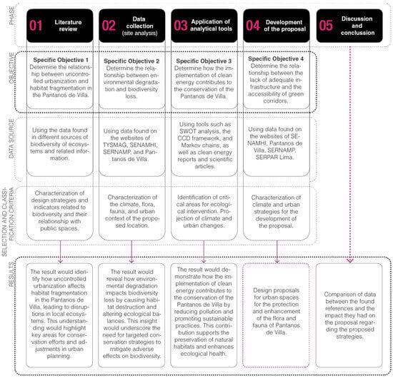 In Figure 5, the research phases are outlined. The process began with a literature review in Phase 1, using various data sources on biodiversity and habitat fragmentation in Pantanos de Villa. In this phase, we characterized design strategies related to biodiversity and their connection to public spaces. Phase 2 involved data collection from reliable sources such as SENAMHI, TYSMAG, and SERNAMP, aiming to analyze the relationship between environmental degradation and biodiversity loss while characterizing the climate, flora, fauna, and urban context of the proposed area. In Phase 3, analytical tools like SWOT analysis, the Markov chain, and the CCD framework were applied to identify critical areas for ecological intervention, projecting climate and urban changes. The implementation of clean energy and its contribution to the conservation of Pantanos de Villa was also explored. Phase 4 focused on developing design proposals that incorporated green corridors and urban spaces to protect local flora and fauna. Finally, in Phase 5, we compared the collected data with existing references, assessing the impact of the proposed strategies in addressing the initial problem. The overall objective of the process was to propose designs that promote ecosystem and biodiversity conservation in Pantanos de Villa, particularly through green infrastructure and clean energy implementation.