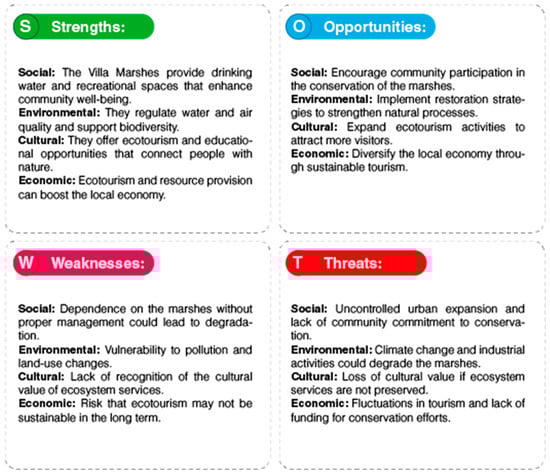 As shown in Figure 6, the analysis of the ecosystem services of Villa Marshes indicates that proper management can enhance water and air quality, support biodiversity, and improve community well-being. However, inadequate management could lead to ecosystem degradation, affecting its ability to regulate the environment and provide resources. Vulnerability to pollution and land use changes, along with a lack of cultural recognition and the risk of unsustainable ecotourism, may reduce these benefits. Therefore, implementing conservation strategies is crucial to maximize benefits and minimize losses.