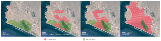 In Figure 9, it can be observed that, initially, this coastal ecosystem was an extensive area of wetlands, mangroves, and lagoons, serving as a refuge for varied fauna and flora. However, over the decades, urban growth and the expansion of Lima city have exerted significant pressure on this natural space, causing the degradation of its environment and loss of biodiversity [33].