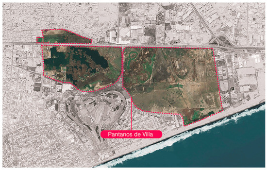 In Figure 6, the study area corresponding to Pantanos de Villa is diagrammed, located on the central coast of Peru, specifically in Chorrillos, an important district of the capital of Peru. It is emphasized that this place encompasses marine areas, urban areas, and areas with vegetation, and is also an area that hosts protected zones, such as Pantanos de Villa.