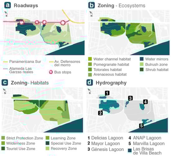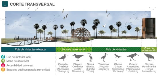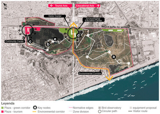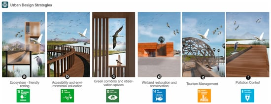 As shown in Figure 13, the proposed design strategies for Villa Marshes are oriented toward the preservation and valorization of this unique ecosystem. Ecosystem-friendly zoning, wetland restoration, educational accessibility, pollution control, and the creation of green corridors and observation spaces, along with sustainable tourism management, are combined to ensure a harmonious coexistence between biodiversity conservation and visitor experience. These measures not only aim to protect the hydrography and flora and fauna of the marshes but also promote environmental awareness and the active engagement of the community and visitors in the preservation of this valuable ecosystem.