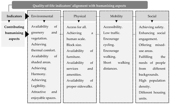 It is obvious that considering the humanising aspects can result in a better quality for urban life. Hence, we can map and categorise these manifold aspects under the common indicators for quality of life to decide which aspects fall under which indicators and better serve the ability to achieve the goal of a better quality of life for the inhabitants. The economic indicator will be excluded as it is out of the scope of this research and is not related directly and strongly to the humanising approach, unlike the other four. Figure 3 shows this alignment between the humanising aspects and the quality-of-life indicators.