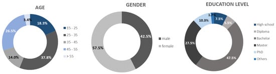 Based on the results collected from the participants’ responses to the first section of the questionnaire, “personal information”, it was found that the dominant group of participants were 15 to 35 years of age and had received higher education as well. The number of female participants was, to some extent, more than male participants, as can be seen in Figure 4.