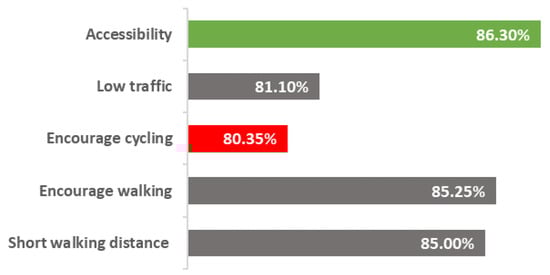 The following Figure 5 shows the resulting relative weights of the mobility indicator’s humanising aspects. The highest percentage of 86.30% was awarded to “accessibility” as the most important aspect, which in turn promotes quality of life by providing a well-designed network, supporting walkability and cycling, and decreasing dependency on cars. However, the “encourage cycling” aspect achieved the lowest priority among other aspects, with 80.35%. The other high values indicated the importance of walkability and fulfilling pedestrian needs. It is worth mentioning that some of the participants proposed paying more attention to walking and using public spaces in the city, by fostering sidewalks, bicycle lanes, and shaded areas and considering proper walking distances to services.