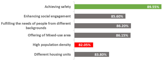 The following Figure 7 shows the resulting relative weights of the social indicator’s humanising aspects. The highest percentage of 89.55% was awarded to “achieving safety” which in turn promotes quality of life by ensuring the participation of every member of society, including older adults, people with disabilities, women, and children, while the “highest population density” aspect achieved the lowest priority, at 81.65%. The other high values indicate the importance of mixed use on supporting the vibrancy of open and public spaces. It is worth mentioning that some of the participants proposed paying more attention to considering all ages while planning for public activities.