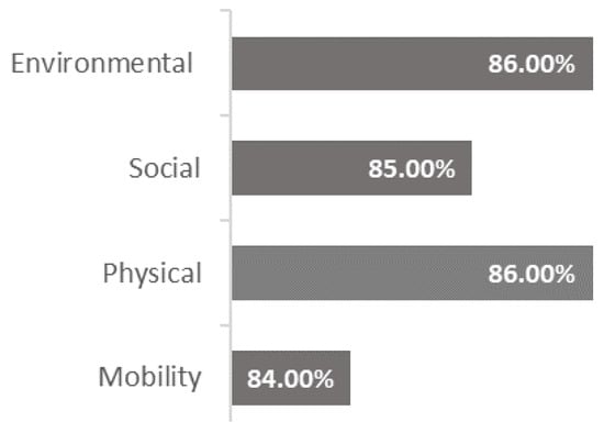 Figure 6 shows the resulting relative weights of the physical indicator’s humanising aspects. The highest percentage of 87.20% was awarded to “availability of services and amenities”, which in turn promotes quality of life by fostering friendly pedestrian environments to achieve the inhabitants’ satisfaction, while “access for all” came close with 86.85%. However, the “block size” aspect achieved the lowest priority among other aspects, with only 81.65%. The other high values indicate the importance of accessibility and walkability. It is worth mentioning that some of the participants proposed paying more attention to walkways, using sustainable resources, the integration of greenery, and litter bins.