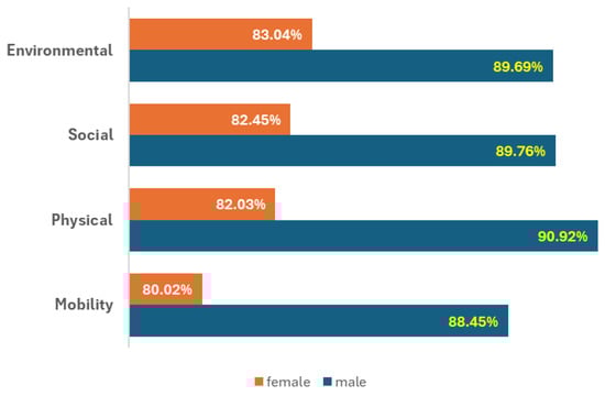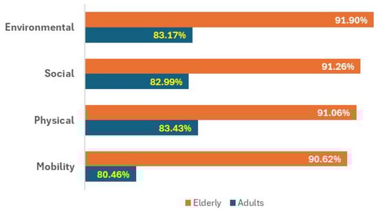 The following Figure 12 shows that both categories—adults (up to 45 years old) and elderly—gave the lowest priority to the “mobility” indicator. However, for older adults, the preference was towards the “environmental” indicator, while adults gave the “physical” indicator the highest priority.