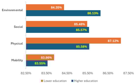 The following Figure 10 shows that male and female users share the same finding that the “mobility” indicator has the lowest priority among all other indicators and the “social” indicator takes second priority. However, male users’ preference goes to the importance of the “physical” indicator, while female users selected the “environmental” indicator as the highest priority to be considered for promoting humanising aspects of open spaces. Figure 11 shows that both the categories lower education (undergraduate) and higher education (postgraduate) share the same finding that the “mobility” indicator has the lowest priority among all other indicators, and the “social” indicator takes second priority. However, users with higher education gave importance to the “environmental” indicator, while those without higher education selected the “physical” indicator as the highest priority.
