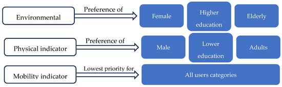 Accordingly, Figure 13 demonstrates the users’ preferences for all the categories as was found from the surveys’ results. The environmental indicator was the preference of females, those with higher education, and older adults, while males, those without higher education, and adults preferred the physical indicator. These preferences can be analysed and justified through further research to investigate the link between people’s choices and preferences, and demography.
