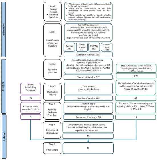 To ensure the inclusion of the relevant articles and to have a comprehensive scope, two methods have been chosen: backward and forward snowballing and direct search. The direct search was performed by searching with similar predefined keywords in databases of three high-impact journals related to medicine: JAMA, The Lancet, and Nature. Snowballing forward and backward was implemented to ensure a high-quality database with a special focus on the built environment, health, and well-being covered in this scoping review. After implication, the direct search and snowballing of the final sample of this scoping review resulted in 71 papers. The 71 papers were categorized in the Excel matrix (Version 16.89.1).