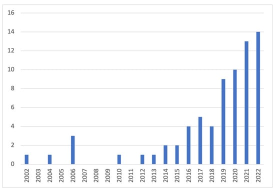 In general, the research in this scoping review about the impact of the built environment on health and well-being started in 2002 and increased over time. No set limitation for exclusion based on the publication year indicates the new interest in research about this interdisciplinary field. A notable increase in publications was identified from 2012 from the examined papers. The increasing trend in the publication rate is noticeable in Figure 2 with a positive slope.