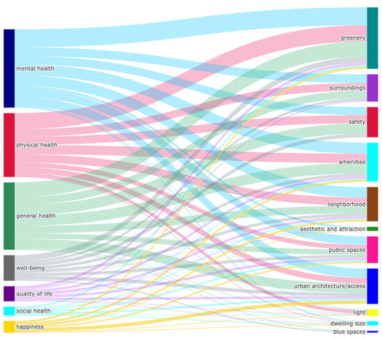 Studies investigated the relation between general health and the built environmental factors. Greenery, urban architecture and accessibilities, safety, surrounding environment, public spaces, light, neighborhoods, and amenities were found to be impactful on general health [15,16,60,61,63,64,65,66,69,73,74,75,76,79,83,84,85,86,88,90,91,92,93,95,105,109,110,111,113,114,115,118,122,125]. Environmental factors such as accessibility, diversity, street network connectivity, infrastructure, and safety were connected to the reduction of stress levels, increasing physical activity, and enhancing overall health status [118]. Urban infrastructure such as street lighting and crosswalks were associated with a lower adult homicide rate. Parks and well-maintained vacant spaces as green and clean spaces were related to a decrease in homicide rates [60]. The increase in residential greenness and reduction in air pollution have a positive impact on the general health condition of residents [86]. Connected parks for more accessibility and effective spatial greenery strategy contribute to health promotion and health equity. Increasing exposure to greenery leads to a decreased risk for various diseases [63]. The view of blue spaces from residential areas was effective on the general health conditions of individuals [91]. Dwelling size was positively associated with overall health and leisure satisfaction [114].