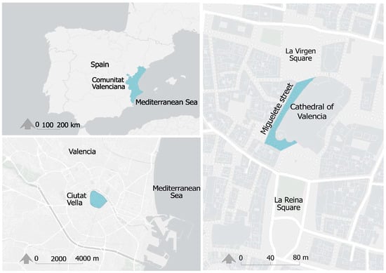 In order to practically use the monitoring system, and following the example of Long & Zhang (2024) [], digital technologies were applied as new elements in the streets of the historic centre of Valencia (Spain). This city is considered as an urban laboratory where researchers can conduct experiments, thus enabling the analysis of data generated from digital devices and the facilitation of design and implementation processes. Furthermore, situations of overcrowding and congestion were beginning to be observed in the historic centre spaces of Valencia. Therefore, it was pertinent to establish quality standards for pedestrian flows (residents and visitors) in the urban heritage space for the reasons of people’s physical and psychological comfort and also for safety reasons. Miguelete Street was the selected space for monitoring these parameters because of its geographical location, flanking a cathedral and connecting two socially and touristically significant squares in Valencia, La Virgen and La Reina (Figure 1). This street is a linear urban space where access to the cathedral, that is the most important religious building of the city, is compulsory. It is between 5 and 8 m wide and allowed for a good angle of view for the camera on the movements of people in the space, making it a noteworthy testing area. This street has high pedestrian traffic, especially visitors, and holds a scarce presence of static activities in the public space (such as restaurants or cafes’ outdoor dining areas, only some street vendor stalls) that can obstruct the walkway other than people themselves.