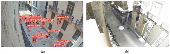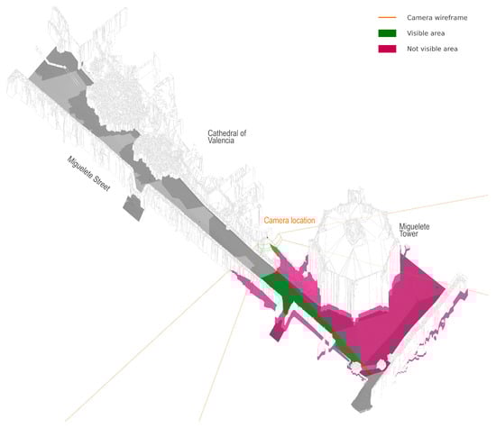 The first step in the process was to determine the Usable Surface for Visitation within the field of vision of the camera. This was achieved after the viewshed was obtained from a 3D model derived from a point cloud and a micro-urban-scale DTM of the street. The digitization process is detailed in previous works [,]. The viewshed was calculated with ArcGIS Pro 3.2.2 (Figure 4) and cross-referenced and refined with frames taken directly from the camera to validate the results.