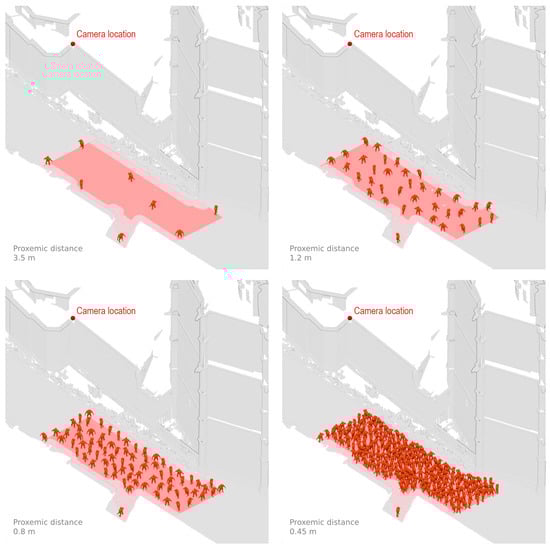 Similarly, other limitations appear, such as identifying events that may act as triggers. While it is possible to recognize official events like local traditional festivals, there is a wide range of informal or spontaneous events, such as those created by street performers or protests, which are not comprehensively tracked. Another limitation is the use of global proxemic distances, which may not fully account for the heterogeneity of pedestrians; in other contexts, these measures might vary according to cultural environments, as other authors suggest []. On a technical level, a further challenge involves managing the data collected by cameras, requiring database systems capable of handling large volumes of information; data loss can also occur due to issues such as signal disruptions, power failures or data transmission errors.