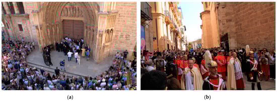 | Virgen de los Desamparados festivity(Figure 7b) | Various events take place throughout the day, with the most important being the procession of the Virgin from the Basilica to the cathedral. The procession enters through the Baroque door and travels the entire length of Miguelete Street. | Second Sunday of May. D’Infantes’ Mass: 8:00 Procession: 10:30 Pontifical Mass: 12:00 Fireworks (Mascletà): 14:00 |
