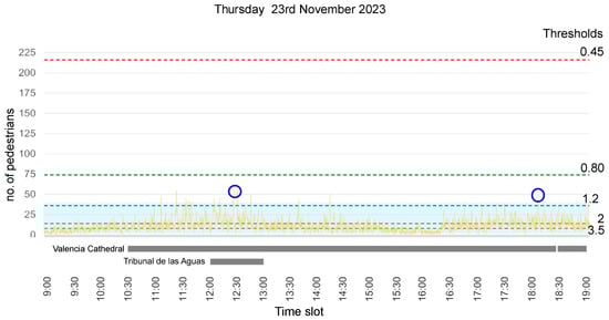 Data were collected for each day with respective thresholds and triggers. On 23 November 2023 (Figure 8), the total number of pedestrians was 38,436. Two triggers related to events were identified. The first occurred at 12:21:21 with 56 people, surpassing one of the proposed thresholds continuously. This time coincides with the end of the Tribunal de las Aguas (Water Tribunal of the plain of Valencia) event. The second trigger occurred at 6:04:00 p.m., with 49 people, once again surpassing a threshold. This is associated with the start of free visits to the Valencia Cathedral, which begins at 18:30.