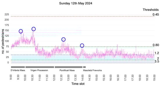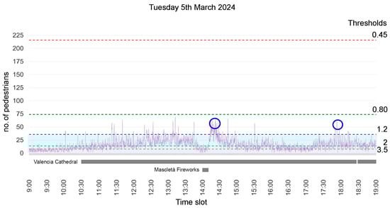 Figure 9 shows a graph of the pedestrian count for 5 March 2024. On this day, 54,696 persons were recorded. A trigger occurred at 14:13:59 with 60 pedestrians, surpassing one of the established thresholds. This trigger coincides with the end of the Fallas’ fireworks (Mascletà) at a place close to Miguelete Street. Notably, there is a significant drop in pedestrian density in the minutes before and after 14:00, almost to a complete halt, followed by a rapid recovery of the flow after the event concludes because Miguelete Street is a key transit street. The next trigger was produced at 17:52:50 and is again linked to the end of the guided tours and the beginning of free visits to the Valencia Cathedral at 18:30.