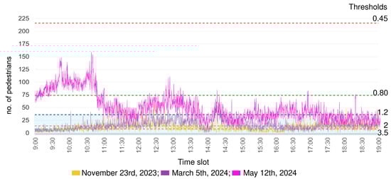 The data were grouped by days within the interval of 9:00–19:00, maintaining readings taken every 10 s. This allowed for the detection of peak moments in the number of people throughout the day. To facilitate reading the resulting graph, a temporal marker as added every 30 min, showing the relative occurrences of these peaks. Proxemic threshold values were introduced as a constant, providing a clear visualization of the saturation threshold at any given moment.