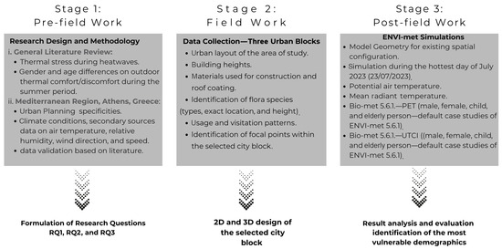 The research is structured into three distinct phases, as outlined in Figure 1. The first phase involves pre-fieldwork analysis, which includes a comprehensive literature review with a particular emphasis on thermal stress analysis during heatwaves in the Mediterranean region. This review focuses specifically on studies examining gender and age differences in thermal comfort during such extreme weather events. The first phase of this study culminates in the formulation of four key research questions centered on Physiologically Equivalent Temperature (PET) and Universal Thermal Climate Index (UTCI) values [41,42]. PET serves as a vital index for evaluating thermal comfort in outdoor environments, quantifying the impact of air temperature, humidity, wind speed, and solar radiation on human perception. It is particularly valuable in urban climate research, allowing for comparisons of thermal comfort across various demographic groups and conditions [43]. UTCI is a comprehensive index that incorporates multiple meteorological factors, reflecting physiological responses to thermal environments and facilitating the assessment of outdoor thermal stress in diverse populations and climates. PET is calculated using heat exchange models that simulate the thermal environment experienced by an individual, providing a direct measurement of comfort in degrees Celsius. UTCI, however, is derived from a more complex model that includes a broader range of physiological responses based on a reference individual, enabling a more extensive evaluation of both comfort and physiological stress in varying thermal conditions. It is important to note that PET and UTCI are the two most commonly used thermal indices among the over 160 outdoor thermal indices currently available [44].