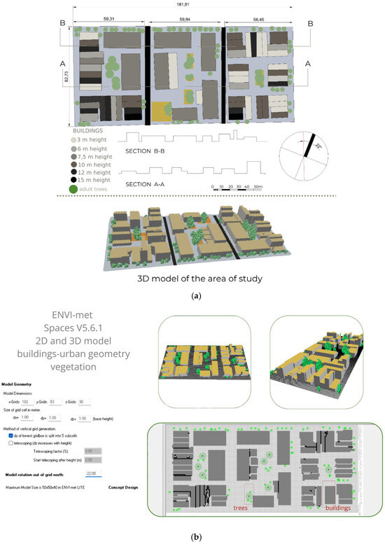 Figure 2. (a) Spatial layout of the area of study, 2D and 3D models; (b) 2D and 3D ENVI-met Spaces V5.6.1 model.