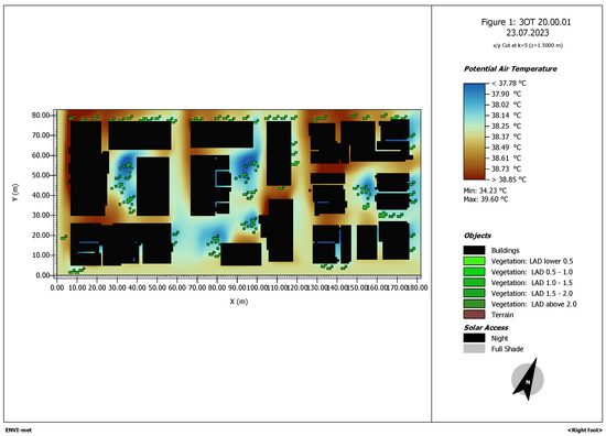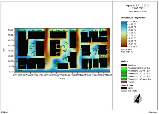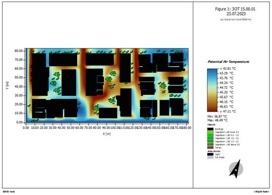 Figure 4. ENVI-met simulation of the area of study. Potential air temperature at 3 p.m.