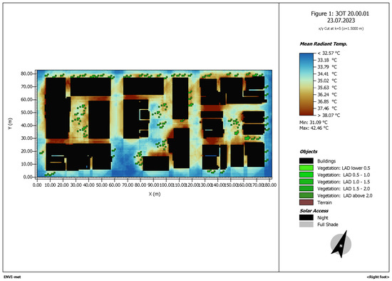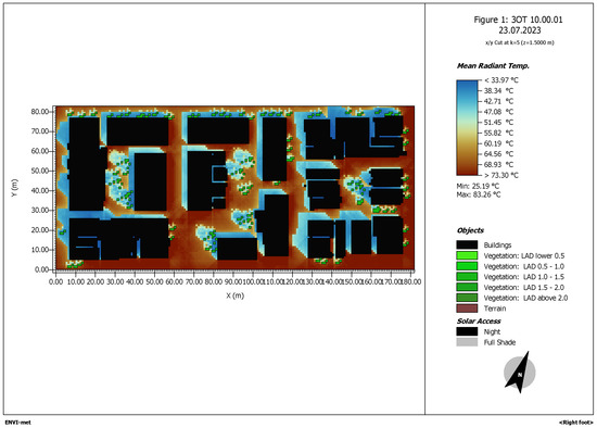 Figure 6. ENVI-met simulation of the area of study. Mean radiant temperature at 10 a.m.