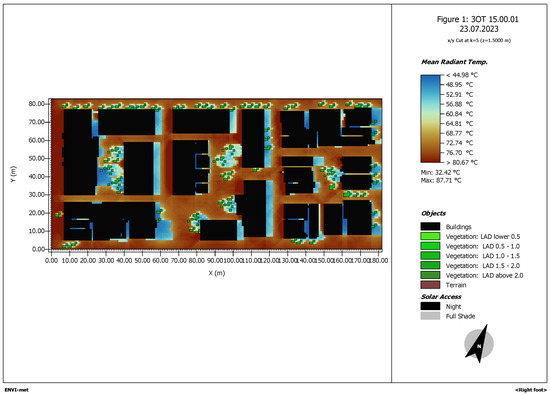 Figure 7. ENVI-met simulation of the area of study, mean radiant temperature at 3 p.m.