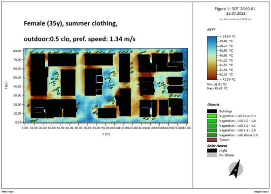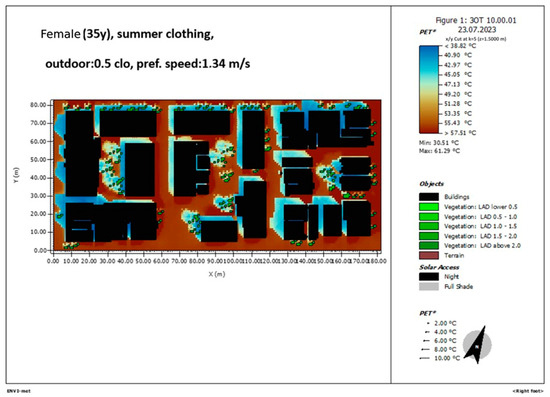 Figure 10. ENVI-met simulation of the area of study. PET 10 a.m., female 35 years old, summer clothing, 0.5 clo, pref.speed 1.34 m/s.