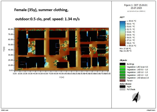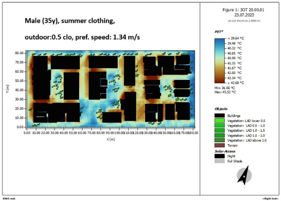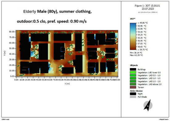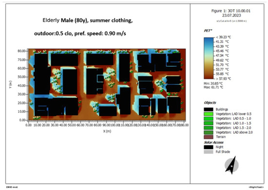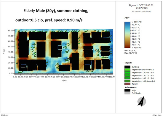 Figure 11. ENVI-met simulation of the area of study. PET 10 a.m., elderly male 80 years old, summer clothing, 0.5 clo, pref.speed 0.90 m/s.